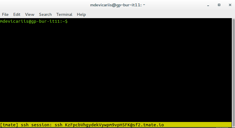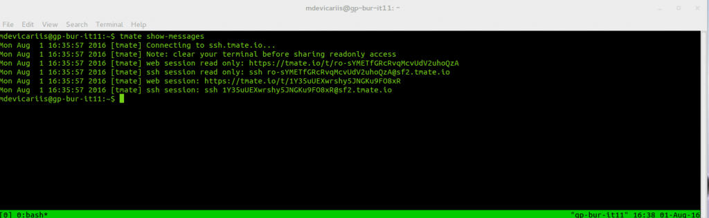 Now, there’s tmate. It’s a fork of tmux and they can both be installed and work on the same machine. It provides a secure, one-time connection to your box (as long as you close the session when you’re done). Once you establish the sesison, you can share the connection ID with anybody you want to share your screen with. You can share the connection ID was a number of people. I use this as a way to share the console with vendors. This way they only get access to the boxes they need to work on without sharing a full workstation screen. I can be working on other tasks while they’re looking around or researching on their end.